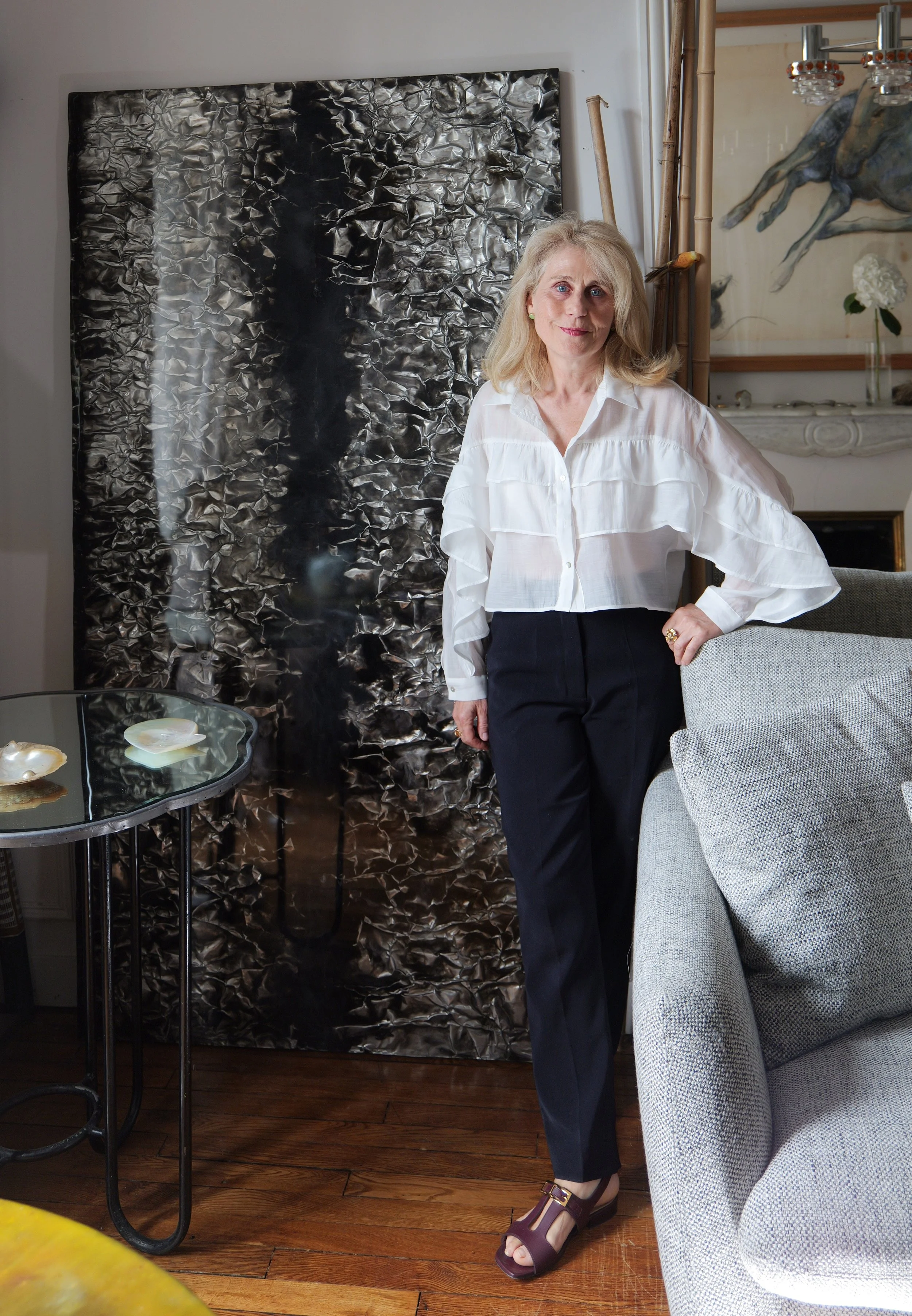 Une femme blonde en chemise blanche et pantalon noir se tient dans un salon avec un canapé gris, une table en verre avec des coquillages et une œuvre d'art métallique en arrière-plan.